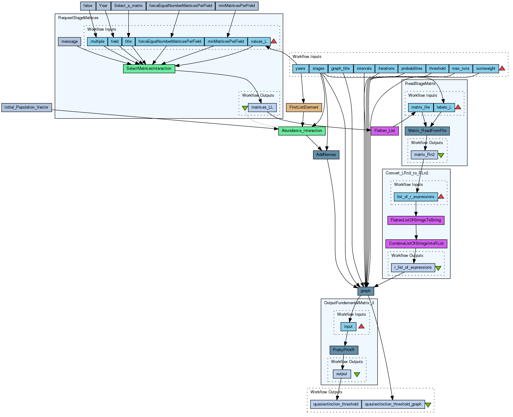 This workflow estimates by simulation the quasi-extinction probability time cumulative distribution function for a structured population in an independently and identically distributed (iid) stochastic environment. This workflow is based on the popbio package (stoch.quasi.ext - Calculate quasi-extinction threshold, Stubben, Milligan and Nantel, 2013) based on the The MATLAB code in Box 7.5 (Morris and Doak 2002). For more details of the analysis see: Calculating the probability of hitting a quesi-extinction threshold by time t, method: simulating extinction probabilities (Morris and Doak 2002, pag: 241-244 and Caswell 2001, pag: 443-444).