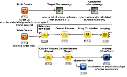 In the Open PHACTS project, we have developed KNIME utility nodes that can be set to automatically leverage the desired content from Open PHACTS web services and simplify the construction of workflow processes. In this workflow we use the these KNIME nodes (which can be down loaded here: https://github.com/openphacts/OPS-Knime ) with the Open PHACTS API call Target Pharmacology with filter minEx-pChembl=5 followed by Compound Pharmacology with minEx-pChembl=0. to answer scientific competency question Q3; Given a target find me all actives against that target. Find/predict polypharmacology of actives.