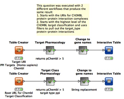 In the Open PHACTS project, we have developed KNIME utility nodes that can be set to automatically leverage the desired content from Open PHACTS web services and simplify the construction of workflow processes.  In this workflow we use the these KNIME nodes (which can be down loaded here: https://github.com/openphacts/OPS-Knime ) with the Open PHACTS API call Target Class Pharmacology and filters target_type=ppi and minEx-pChembl=5 to answer scientific competency question Q8: Identify all known protein-protein interaction inhibitors.