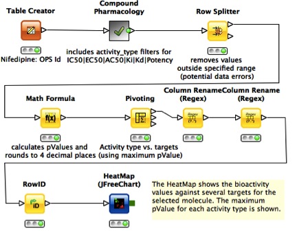 In the Open PHACTS project, we have developed KNIME utility nodes that can be set to automatically leverage the desired content from Open PHACTS web services and simplify the construction of workflow processes.  In this workflow we use the these KNIME nodes (which can be down loaded here: https://github.com/openphacts/OPS-Knime ) with the Open PHACTS API call Compound Pharmacology with filter activity_type=IC50|EC50|AC50|Ki|Kd|Potency to answer scientific competency question Q9: For a given compound, give me the interaction profile with targets.