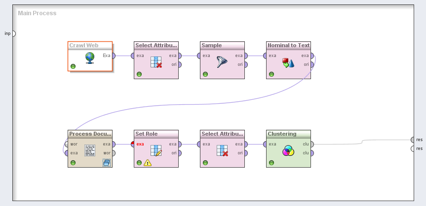 This example process crawls the web (RapidMiner forum) for entries, extracts the information with the Process Documents operator and applies Clustering on the results. The process shows the interaction between the Web Mining Extension and the Text Mining Extension from RapidMiner.
