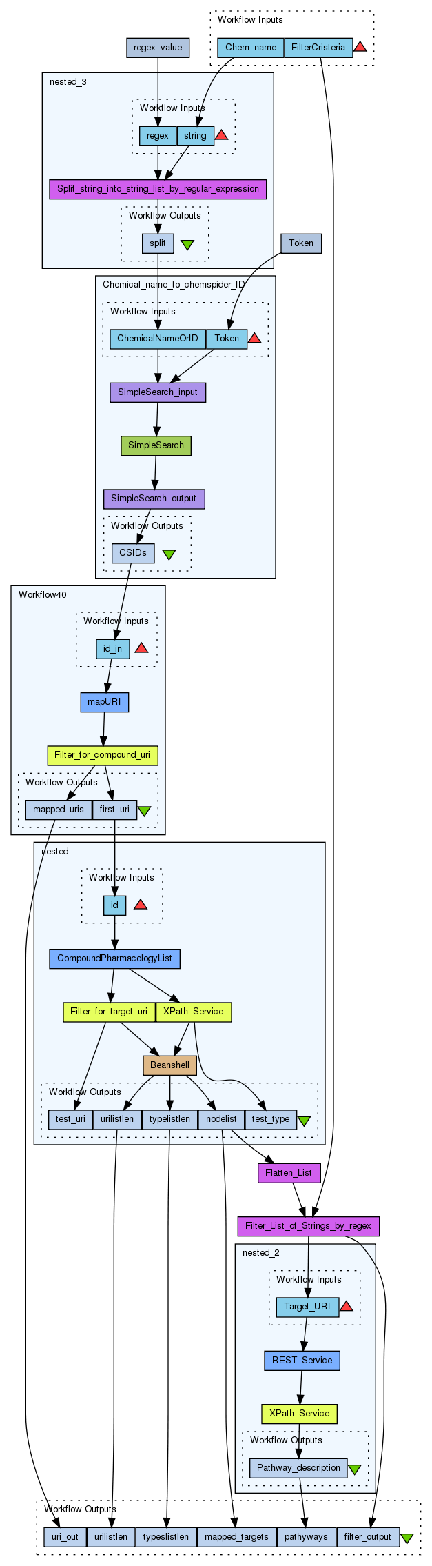 This workflow will map a chemical name or identifier to uniform resource identifiers (URIs). First the ChemSpider web service is used to map the chemical name to a ChemSpider identifier, then the ChemSpider identifier is mapped to URIs via the Open PHACTS platform.