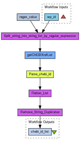 This workflow uses the WikiPathways Webservice/API to query to retrieve all Chemical Entities of Biological Interest (ChEBI) identifers for all pathways and merge them to one, unique list.