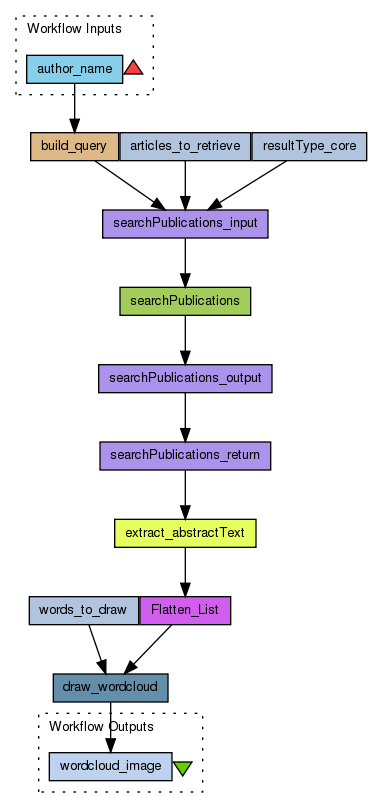 This small workflow demonstrates how to connect to and use Europe PMC (http://europepmc.org/RestfulWebService). The workflow searches the publications of an author, extracts the abstracts, counts the word frequencies and plot a wordcloud using the R package of the same name. The Rshell plot_wordcloud also applies text mining operations (transformation to lower case, removing punctuation, stripping whitespace and removing English stopwords) using the R package tm.
