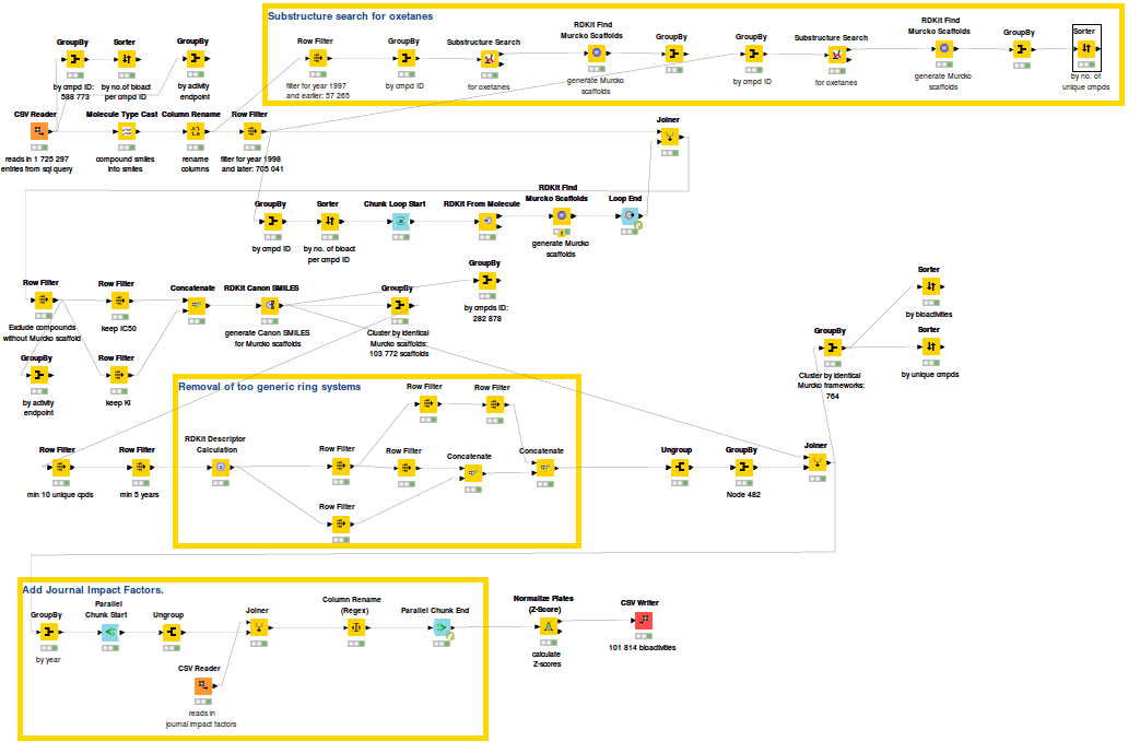 First part of the workflow for paper "The rise and fall of a scaffold: A trend analysis of scaffolds in the medicinal chemistry literature" by B. Zdrazil and R. Guha