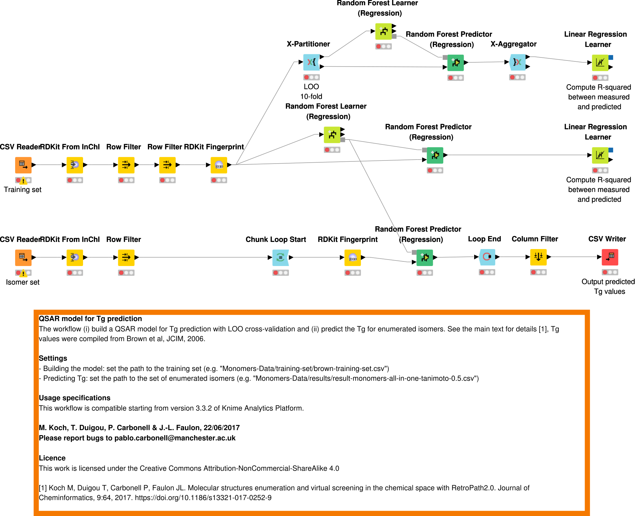 The workflow (i) build a QSAR model for Tg prediction with LOO cross-validation and (ii) predict the Tg for enumerated isomers. See [1] for details. Tg values were compiled from Brown et al, JCIM, 2006.