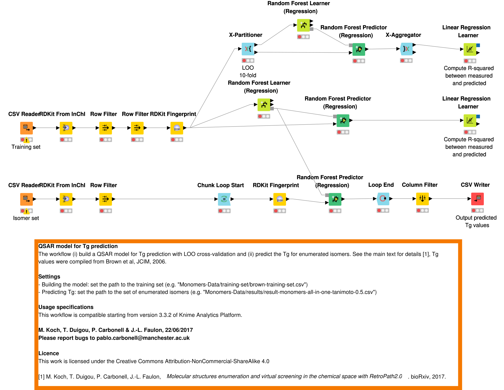 The workflow (i) build a QSAR model for Tg prediction with LOO cross-validation and (ii) predict the Tg for enumerated isomers. See [1] for details. Tg values were compiled from Brown et al, JCIM, 2006.