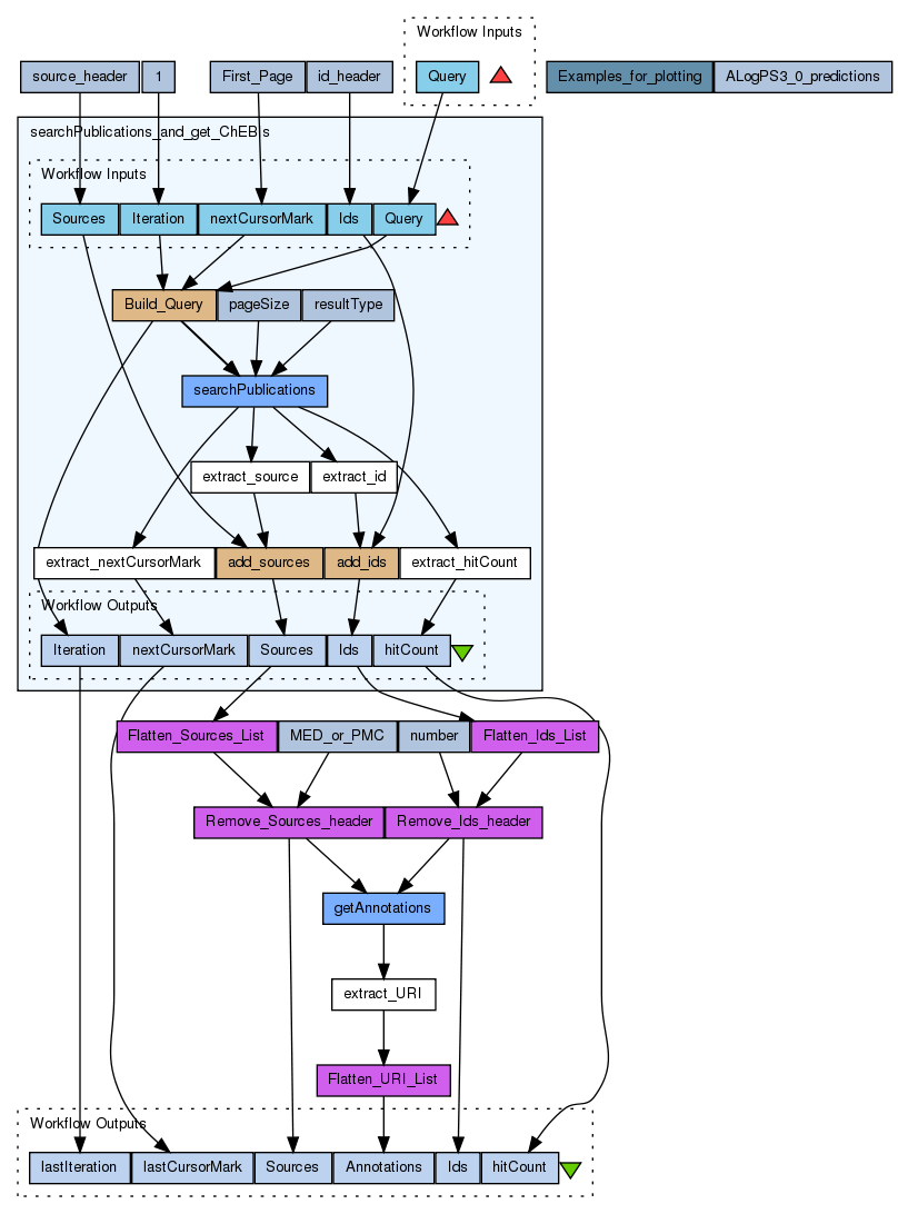 This workflow first conducts a search and downloads the PMIDs for all publications in PubMed and PMC that match a particular query using the Europe PMC Articles API. In a second phase, the workflow fetches the ChEBI annotations for all these publications using the Europe PMC Annotations API.