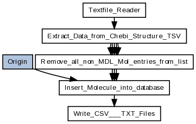 This worklfow load a TSV file from the ChEBI database. (normally structures.tsv) After the extraction of the molecules from the TSV file all non MDL mol files are removed before the valid molecules are inserted into a database.