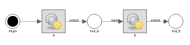 This workflow is a GWorkflowDL representation of a sequence that sequentially invokes A and B.