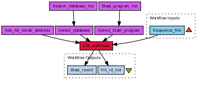 Run a BLAST analysis using the EBI's WSNCBIBlast service (see http://www.ebi.ac.uk/Tools/webservices/services/ncbiblast). This workflow wraps the EBI_NCBI_BLAST workflow to provide a basic user interface which prompts for the required inputs: sequence file, database, BLAST program and user e-mail. Other parameters (e.g. matrix, sort, gap penalties, etc.) are allowed to default.