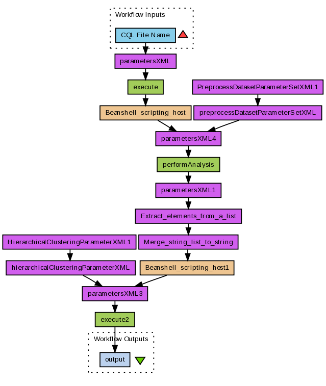 The Taverna workflow contains an input processor to store the CQL expression, an output processor to store the clustered microarray data (both input and output processors are blue), three caGrid processors (green) representing the three caGrid services just listed, and a few “shim” processors, such as XML splitters and beanshell scripts, to deal with data transformation between services.