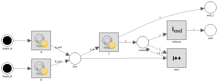 This workflow is a GWorkflowDL representation of a structured discriminator (1-out-of-M Join) that invokes C after the first invocation of A or B (M=2). All next (M-1) invocations of A or B are ignored. This is only one out of various possibilities to model this workflow pattern.