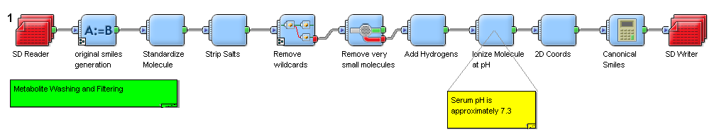 The Wash and Filter workflow performs some processing on incoming structures to filter out those wildcards or unspecified atom types, standardise stereo and charges, and various other adjustments.