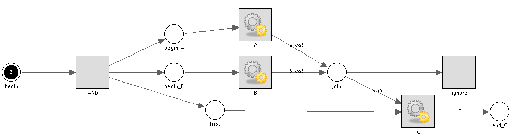 This workflow is an alternative GWorkflowDL representation of a structured discriminator (1-out-of-M Join) that invokes C after the first invocation of A or B (M=2). All next (M-1) invocations of A or B are ignored for the same data group. Other tokens on the place "begin" can be processed recurrently if they belong to another data group.