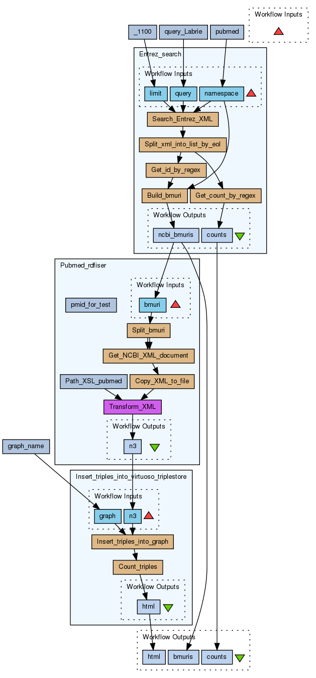 This workflow build a mashup in your local virtuoso server (available at http://localhost:8890/sparql) by downloading the needed pubmed documents from NCBI and by converting them into N3 format.  Once all documents loaded into the triplestore you can query them with SPARQL.
