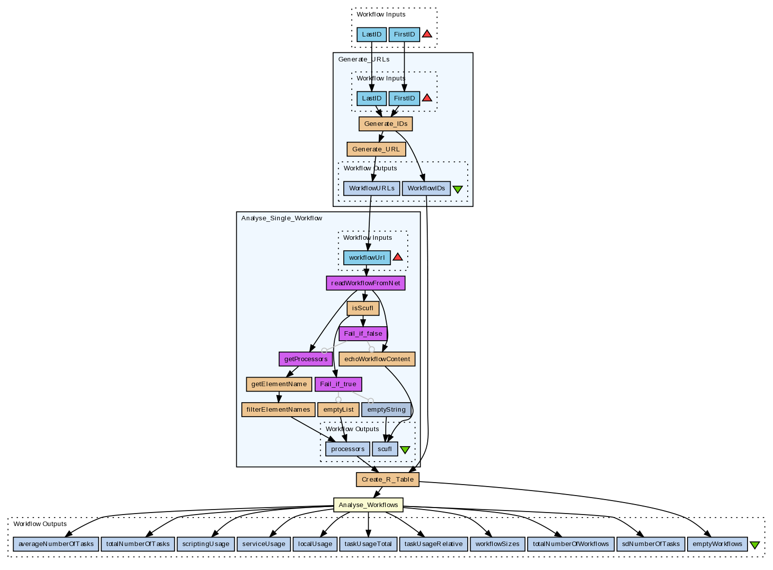 The workflow has two inputs: firstID and lastID. These id's are the id's used in myExperiment to identify the workflows. For example, this workflow has id 648. One has to enter the firstID and the lastID to specify the workflows to be analysed. In the case of the submitted paper, firstID=0, lastID=600. Workflows that do not exists or are not stored as scufl files will automatically be skipped. One can determine the last workflow available at the "latest workflow" section at the myExperiment site. The URL to the workflow "betrays" the id ;).