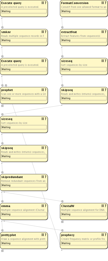 This workflow retrieves a set of protein sequences containing SH2 domain in homo sapiens from NCBI GenBank Protein, then extracts the sequences of SH2 regions and performs a multiple alignment using EMMA and ClustalW. The alignment by EMMA is then plotted to PNG images, simultaneously creating a frequency matrix by prophecy. Finally scan a protein sequence queried with the frequency matrix using prophet.