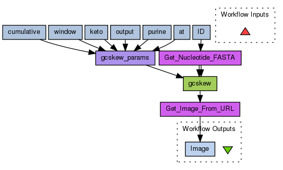 This workflow calculates and graphs the GC skew of a given genome sequence. Use this as a template for using more than 100 analysis programs implemented in G-language Genome Analysis Environment, which can be used in a similar manner. See http://www.g-language.org/ for more information about the G-language Genome Analysis Environment.
