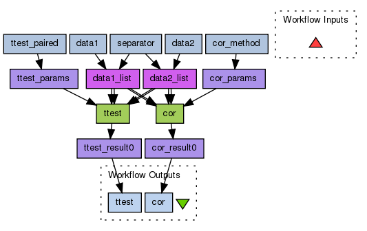 This workflow calculates the Student's T-test and Pearson/Spearman correlations. See http://www.g-language.org/ for more information about the G-language Genome Analysis Environment.