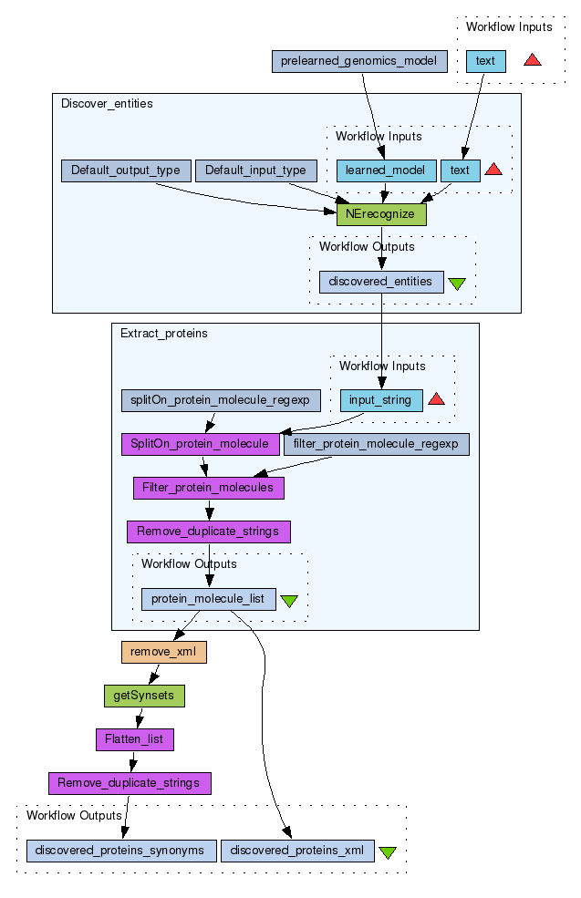 This workflow discovers proteins from plain text and adds synonyms using Martijn Schuemie's proteins synonym service. Proteins are discovered with the AIDA 'Named Entity Recognize' web service by Sophia Katrenko (service based on LingPipe), from which output it filters out proteins. The Named Recognizer services uses the pre-learned genomics model, named 'MedLine', to find genomics concepts in plain text.