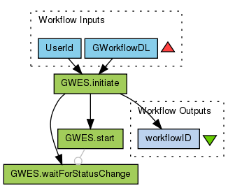 This workflow makes use of the "Grid Workflow Execution Service" (GWES) in order to exececute a GWorkflowDL workflow by means of the Taverna Workbench 2. As the GWES is deployed as a regular SOAP service, the WSDL can be imported as a normal service into the Taverna Workbench.