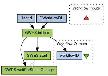 This workflow makes use of the "Grid Workflow Execution Service" (GWES) in order to exececute a GWorkflowDL workflow by means of the Taverna Workbench 2. As the GWES is deployed as a regular SOAP service, the WSDL can be imported as a normal service into the Taverna Workbench.