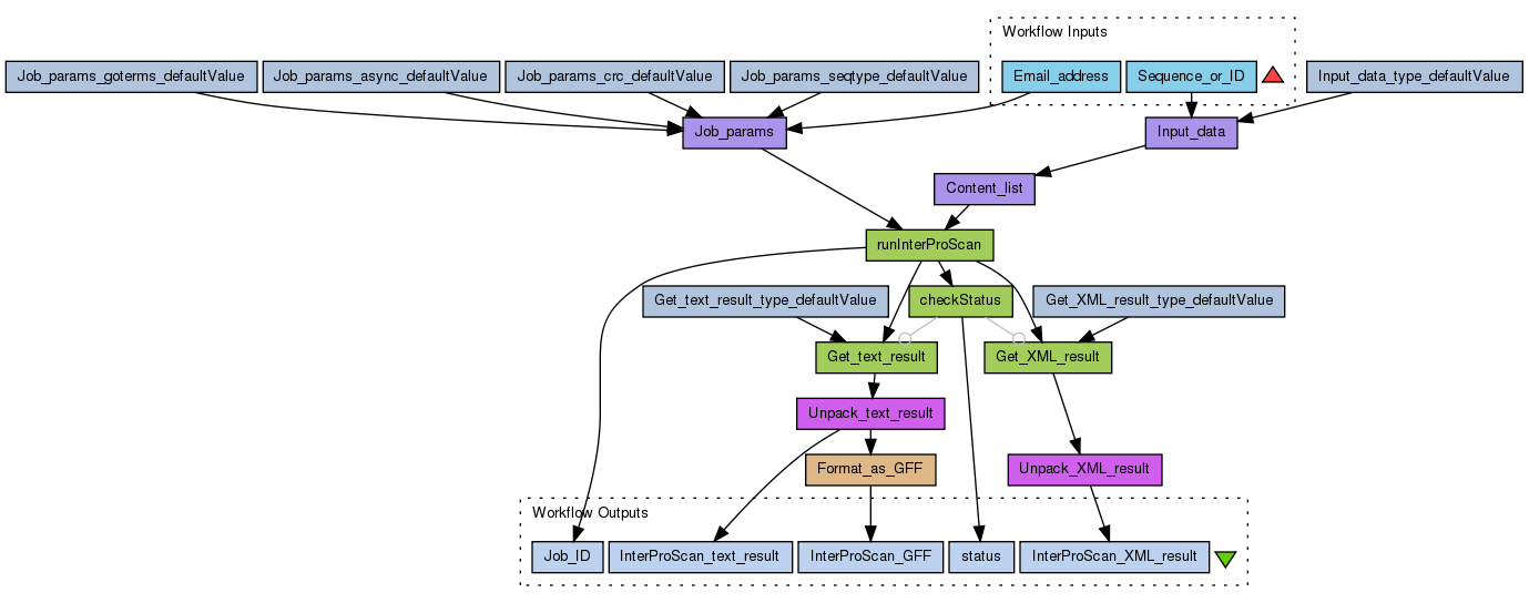 Perform an InterProScan analysis of a protein sequence using the EBI’s WSInterProScan service (see http://www.ebi.ac.uk/Tools/webservices/services/interproscan). The input sequence to use and the user e-mail address are inputs, the other parameters for the analysis (see Job_params) are allowed to default.