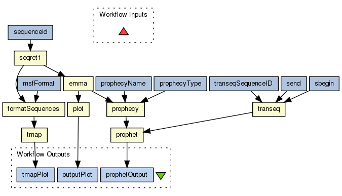 Designed to show the use of EMBOSS based Soaplab services from Taverna, this workflow has no inputs as all initial values are specified as string constants. A sequence set is fetched using the seqret tool, then simultaneously scanned for predicted transmembrane regions and subjected to a multiple alignment using emma. This alignment is then plotted to a set of PNG images and also used to build a profile using the prophecy and prophet tools.