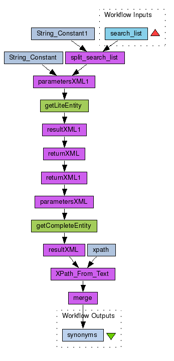 This workflow takes a list of entity names separated by a newline and queries the ChEBI database for synonyms. Thanks to Paul Fisher for resolving the problems with the XML Splitter by using an XPath statement to retrieve synonyms.
