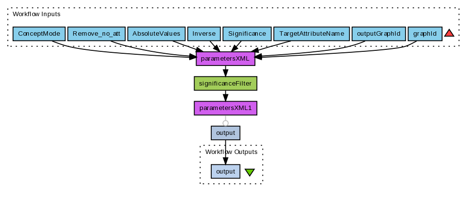 graphId - the ID of the input Graph. outputGraphId - the ID of the output Graph (Optional). If no output graph is specified filtered items will be removed from the input graph. TargetAttributeName - Target AttributeName to filter for significance. Significance - A significance value to filter relations with. Default value is 15.0. Inverse - If set to true only relation smaller than Significance will be kept (Optional). Default value is false (boolean) AbsoluteValues - Absolute GDS values when testing for significance (Optional). Default value is false. (boolean) Remove_no_att - Remove elements without the attribute, if set to true (Optional). Default value is false. (boolean) ConceptMode - If true filters concepts, if false filters realtions (Optional). Default value is false. (boolean)