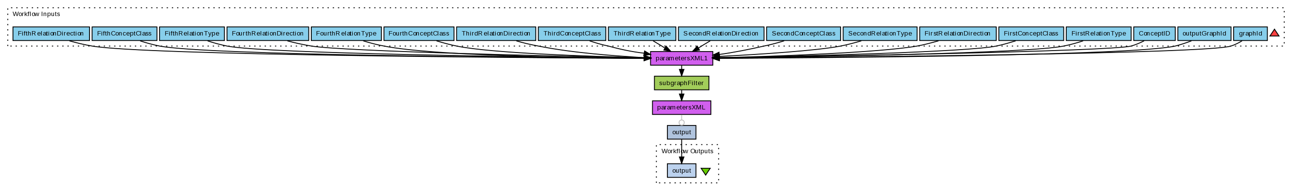 graphId - the ID of the input Graph. outputGraphId - the ID of the output Graph. Optional parameter. If no output graph is specified filtered items will be removed from the input graph. ConceptID - The root concept to start at. Valid value range is 1 to 2147483647. FirstRelationType - RelationType limitation for depth 1 (Optional). FirstConceptClass - ConceptClass limitation for depth 1 (Optional). FirstRelationDirection - Direction of relation for depth 1, one of [both, incoming, outgoing] (Optional). Default value is both. Valid values are [incoming, outgoing, both]. SecondRelationType - RelationType limitation for depth 2 (Optional). SecondConceptClass - ConceptClass limitation for depth 2 (Optional). SecondRelationDirection - Direction of relation for depth 2, one of [both, incoming, outgoing] (Optional). Default value is both. Valid values are [incoming, outgoing, both]. ThirdRelationType - RelationType limitation for depth 3 (Optional). ThirdConceptClass - ConceptClass limitation for depth 3 (Optional). ThirdRelationDirection - Direction of relation for depth 3, one of [both, incoming, outgoing] (Optional). Default value is both. Valid values are [incoming, outgoing, both]. ForthRelationType - RelationType limitation for depth 4 (Optional). ForthConceptClass - ConceptClass limitation for depth 4 (Optional). ForthRelationDirection - Direction of relation for depth 4, one of [both, incoming, outgoing (Optional). Default value is both. Valid values are [incoming, outgoing, both]. FifthRelationType - RelationType limitation for depth 5 (Optional). FifthConceptClass - ConceptClass limitation for depth 5 (Optional). FifthRelationDirection - Direction of relation for depth 5, one of [both, incoming, outgoing] (Optional). Default value is both. Valid values are [incoming, outgoing, both].