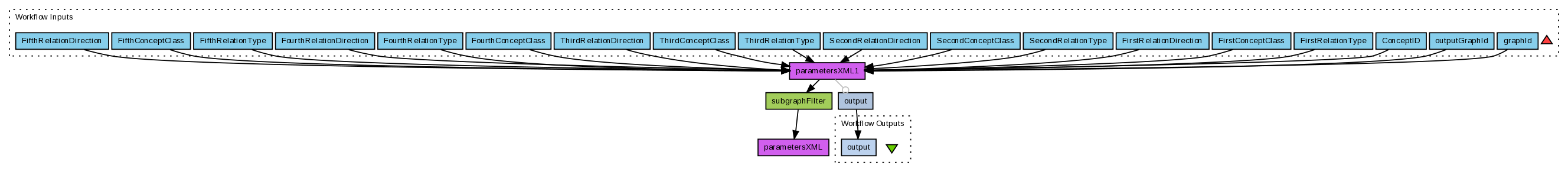 graphId - the ID of the input Graph. outputGraphId - the ID of the output Graph. Optional parameter. If no output graph is specified filtered items will be removed from the input graph. ConceptID - The root concept to start at. Valid value range is 1 to 2147483647. FirstRelationType - RelationType limitation for depth 1 (Optional). FirstConceptClass - ConceptClass limitation for depth 1 (Optional). FirstRelationDirection - Direction of relation for depth 1, one of [both, incoming, outgoing] (Optional). Default value is both. Valid values are [incoming, outgoing, both]. SecondRelationType - RelationType limitation for depth 2 (Optional). SecondConceptClass - ConceptClass limitation for depth 2 (Optional). SecondRelationDirection - Direction of relation for depth 2, one of [both, incoming, outgoing] (Optional). Default value is both. Valid values are [incoming, outgoing, both]. ThirdRelationType - RelationType limitation for depth 3 (Optional). ThirdConceptClass - ConceptClass limitation for depth 3 (Optional). ThirdRelationDirection - Direction of relation for depth 3, one of [both, incoming, outgoing] (Optional). Default value is both. Valid values are [incoming, outgoing, both]. ForthRelationType - RelationType limitation for depth 4 (Optional). ForthConceptClass - ConceptClass limitation for depth 4 (Optional). ForthRelationDirection - Direction of relation for depth 4, one of [both, incoming, outgoing (Optional). Default value is both. Valid values are [incoming, outgoing, both]. FifthRelationType - RelationType limitation for depth 5 (Optional). FifthConceptClass - ConceptClass limitation for depth 5 (Optional). FifthRelationDirection - Direction of relation for depth 5, one of [both, incoming, outgoing] (Optional). Default value is both. Valid values are [incoming, outgoing, both].