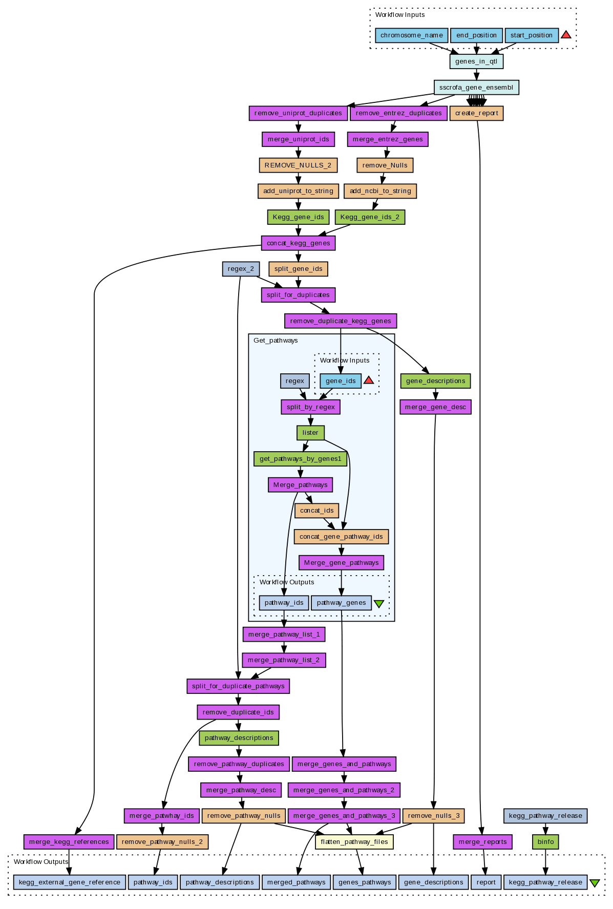 This workflow searches for genes which reside in a QTL (Quantitative Trait Loci) region in the Pig, Sus scrofa. The workflow requires an input of: a chromosome name or number; a QTL start base pair position; QTL end base pair position. Data is then extracted from BioMart to annotate each of the genes found in this region. The Entrez and UniProt identifiers are then sent to KEGG to obtain KEGG gene identifiers. The KEGG gene identifiers are then used to searcg for pathways in the KEGG pathway database.