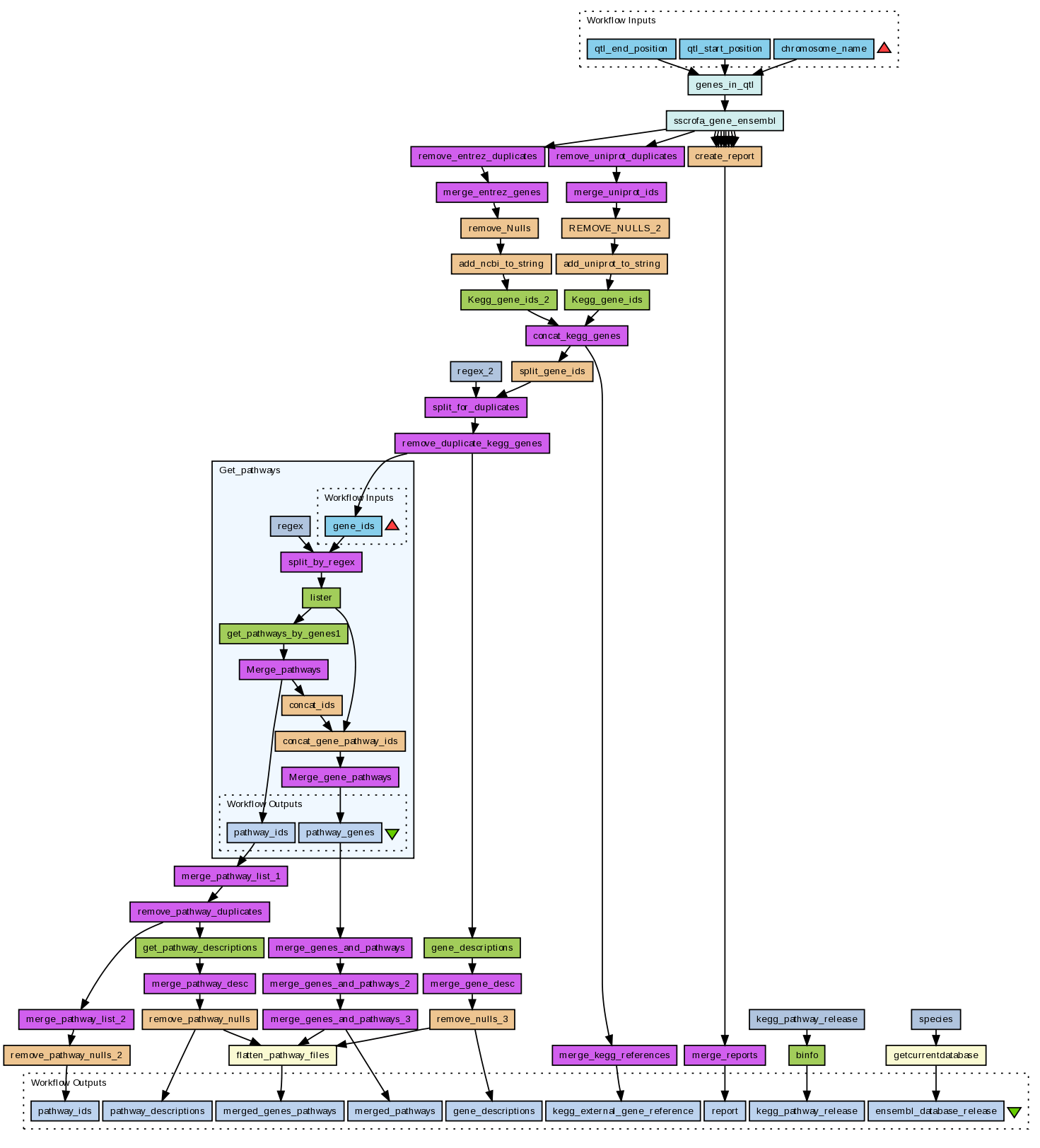 This workflow searches for genes which reside in a QTL (Quantitative Trait Loci) region in the Pig, Sus scrofa. The workflow requires an input of: a chromosome name or number; a QTL start base pair position; QTL end base pair position. Data is then extracted from BioMart to annotate each of the genes found in this region. The Entrez and UniProt identifiers are then sent to KEGG to obtain KEGG gene identifiers. The KEGG gene identifiers are then used to searcg for pathways in the KEGG pathway database.
